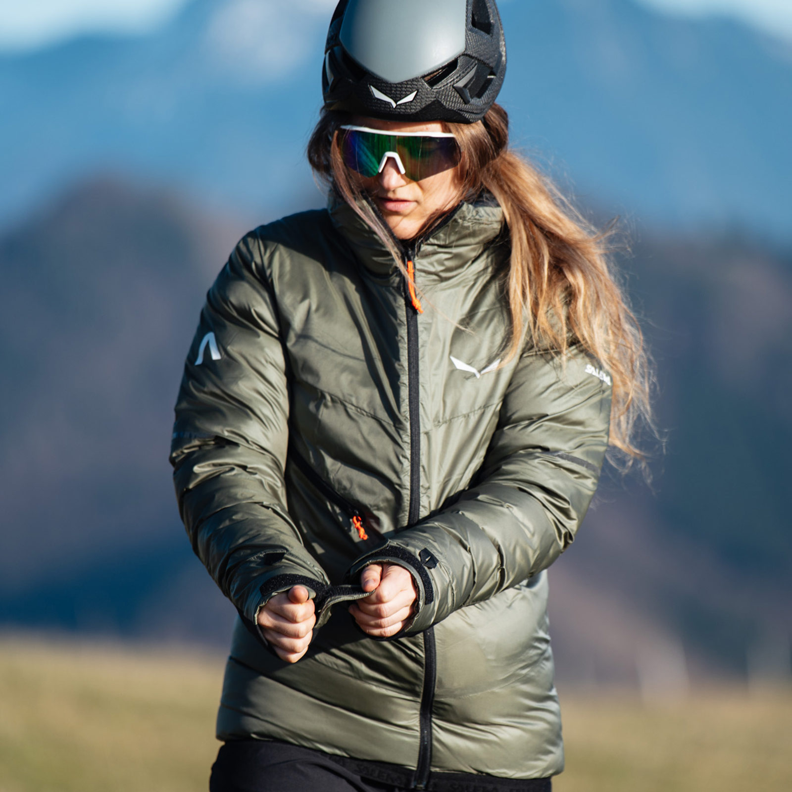 Insulation: 750 fill power down combined with TirolWool® Responsive inserts on the back, cuffs, and collar for targeted warmth and balanced temperature regulation